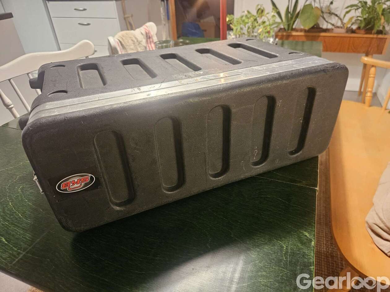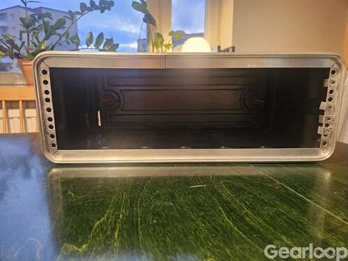 Portabelt och robust rackfordral i svart plast, öppningsbart fram och bak. Lite slitage och har någon gång i användandet öppnat upp med ett mindre hål baktill för att kunna leda ut sladd i stängt läge.