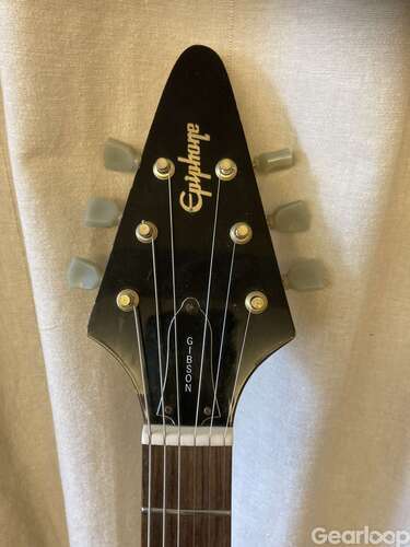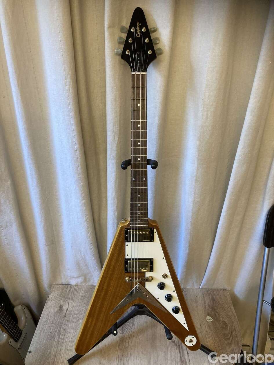 Korea vintage 01. Det här är den trevligaste flying V tycker jag, laddad bakifrån med vingen bakom stallet. Helt original och riktigt skön att spela, mickarna låter ace. Vet ej vad det är för trä men den är massiv och ingen plywood. Toppskick och all justering svara som den ska. Vikten är 3 kg.