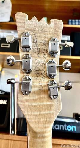 2. Det ursprungliga hårda fodralet finns inte kvar men jag har nyligen fått tag på ett annat case av märke Eastwood i utmärkt skick (bara en liten skav på tolexen och några rester av lim från gamla klistermärken) som passar perfekt. Gitarren har genomgått en fullständig och grundlig kontroll, alla switchar har lödts om eftersom vissa blev kalla, halsen har shimsats ordentligt för att säkerställa optimal action över greppbrädan, banden har precis slipats (fabriks ny var de 1.2mm höga, nu mäter de 1.1mm) och nya D'Addario 10-46's har installerats med låg stränghöjd och justerad intonation. Det är bara att tuta och köra nu alltså. En viss krympning av greppbrädebindningarna har skett och mässingsmarkeringarna på sidan halsen känns väldigt svagt som att de sticker ut, men det är inget värt att göra något åt. Jag har en 7 minuter lång video på gitarren när den sätts igång efter att jag fick tillbaka stallpickupen från renoveringen om det skulle vara intressant att se. Den låter i stort sett exakt som de andra. Max Katzenberger i München gjorde jobbet, han är killen att gå till för allt som har med Mosrite att göra i Europa. Mickarna är P90-liknande och varsin har en 3-läge switch: Halvspole, tyst och helspole. De mäter runt 5-6 kOhm i halvspoleläge och runt 9 kOhm i helspole. En otroligt mångsidig gitarr alltså, det går visst fint att köra Surfmusik eller Punk på den men en del andra stilar funkar utmärkt också. Smal och platt halsprofil med ca. 43 mm bredd vid nollbandet. Svajet funkar som en dröm. Den går att provspelas i replokal vid Skogskyrkogården med en ganska hyfsad rigg eller medtagande av egna prylar om så önskas.