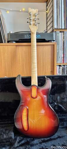 Gitarren har genomgått en fullständig och grundlig kontroll, alla switchar har lödts om eftersom vissa blev kalla, halsen har shimsats ordentligt för att säkerställa optimal action över greppbrädan, banden har precis slipats (fabriks ny var de 1.2mm höga, nu mäter de 1.1mm) och nya D'Addario 10-46's har installerats med låg stränghöjd och justerad intonation. Det är bara att tuta och köra nu alltså. En viss krympning av greppbrädebindningarna har skett och mässingsmarkeringarna på sidan halsen känns väldigt svagt som att de sticker ut, men det är inget värt att göra något åt. Jag har en 7 minuter lång video på gitarren när den sätts igång efter att jag fick tillbaka stallpickupen från renoveringen om det skulle vara intressant att se. Den låter i stort sett exakt som de andra. Max Katzenberger i München gjorde jobbet, han är killen att gå till för allt som har med Mosrite att göra i Europa. Mickarna är P90-liknande och varsin har en 3-läge switch: Halvspole, tyst och helspole. De mäter runt 5-6 kOhm i halvspoleläge och runt 9 kOhm i helspole. En otroligt mångsidig gitarr alltså, det går visst fint att köra Surfmusik eller Punk på den men en del andra stilar funkar utmärkt också. Smal och platt halsprofil med ca. 43 mm bredd vid nollbandet. Svajet funkar som en dröm. Den går att provspelas i replokal vid Skogskyrkogården med en ganska hyfsad rigg eller medtagande av egna prylar om så önskas.