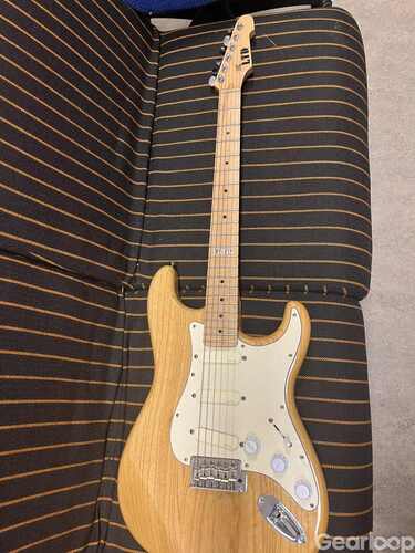 ESP LTD st-213, uppgraderad med EMG DG 20 och med låsbara stämskruvar. Det är tre stycken aktiva single-coils med två stycken olika EQ och boosterkretsar istället för vanliga tonpottar. Den ena boostar botten och topp, den andra boostar mid så att det låter lite humbucker om det hela. Det är jumboband på halsen. Saknar svajarm, men det kan man skaffa andrahand. Kan ev. säljas med gigbag eller möjligtvis ett hardcase mot kostnad, annars skickas i gitarrkartong med stoppning.