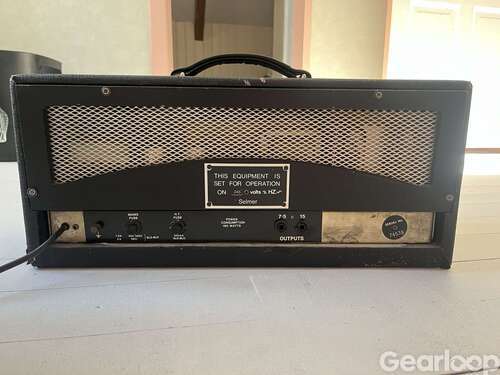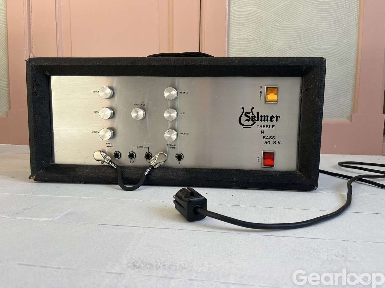 Selmer-topp med aluminiumfront från början av 70-talet. Kretsen för dessa, de sista Treble N Bass-modellerna, var i huvudsak identisk med tidigare modeller. Kontrollpanelens konfiguration är 2 ingångar per kanal, var och en med volym-, diskant- och baskontroller, plus en Presence-kontroll. Bra alternativ till Marshall Plexi.