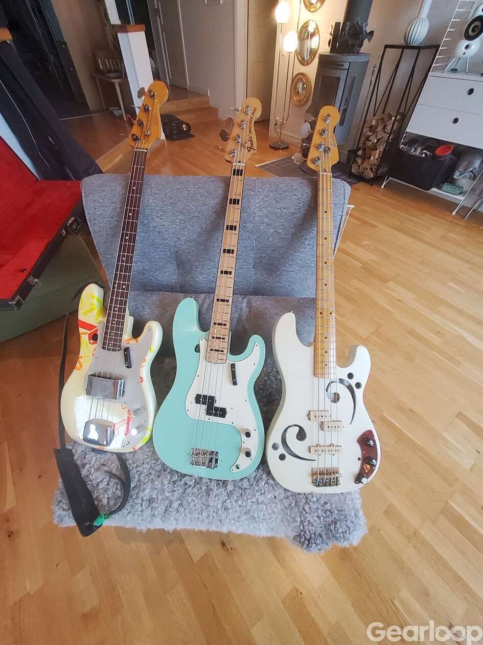 Precision basar av diverse högkvalitativa delar. 7000:-/st. Den hals som har svarta blocks är den enda del som är fender orginal.