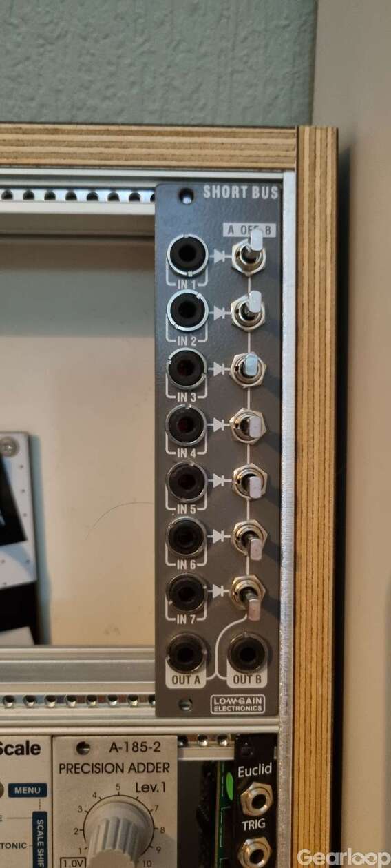 En enkel och smidig router/OR combiner för t.ex. gates. Skicka in upp till 7 signaler och routa dom till antingen buss A eller B. Allt som routas till samma buss summeras, såklart. I mittenläget fungerar varje switch som en mute. Kan jämföras med en switched multiple, men i mitt tycke är denna tydligare utformad. Modulen är även helt passiv!