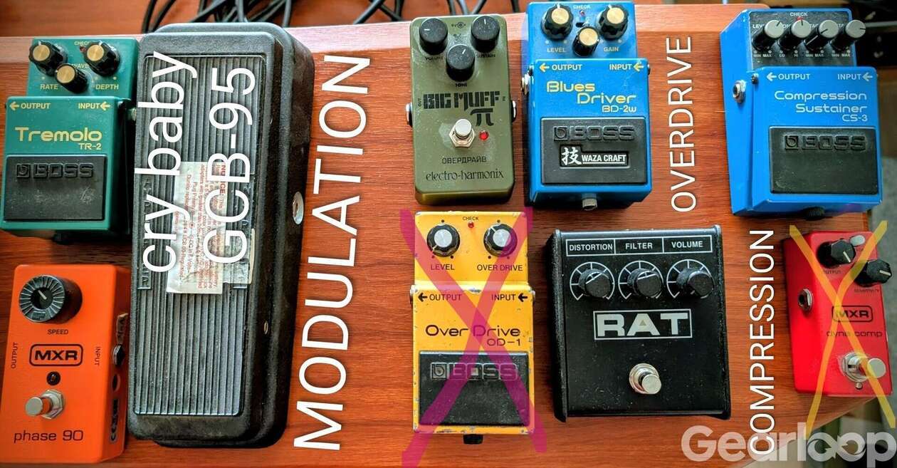 Gitarrpedaler (BOSS TR-2, BD-2W, CS-3, OD-1, ProCo RAT, Cry Baby