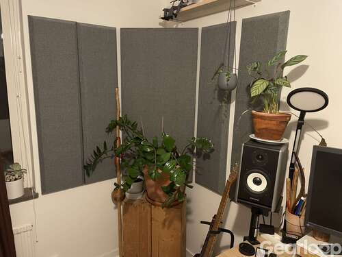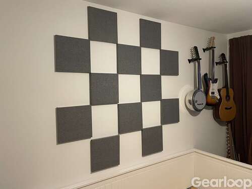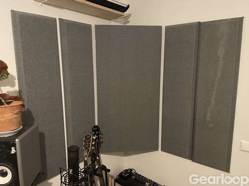 Komplett kit för att akustikbehandla ett rum med både absorbenter och diffusorer. Funkar jättebra! En av plattorna har blivit fläckig av en vattenskada, annars är de i bra skick. Tillhörande upphängningsanordningar följer med, dock bara en per platta.