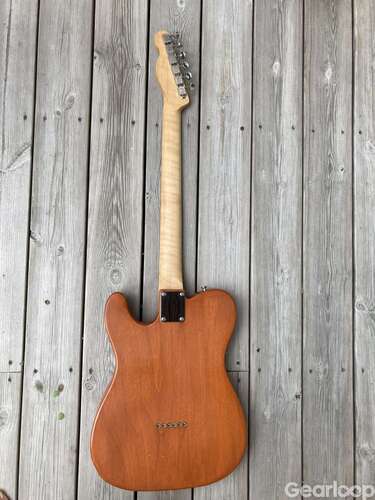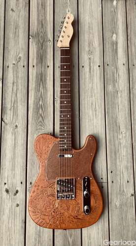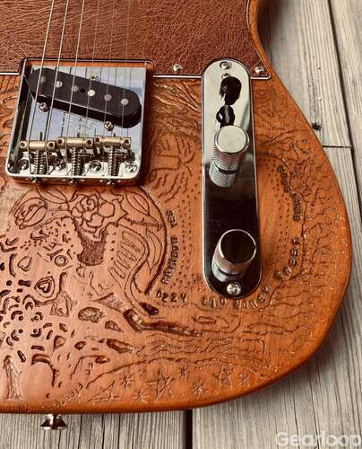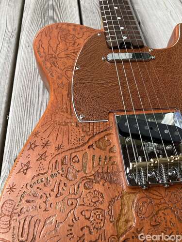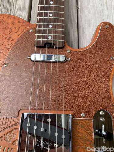 En Telecaster med al-kropp från Hosco, Fender original stall, Bare Knuckle "True grit"-mickar, CTS-pottar och orange-dropp konding. Plektrumskydd i läderlook. GD-Kluson vintage mekanik.