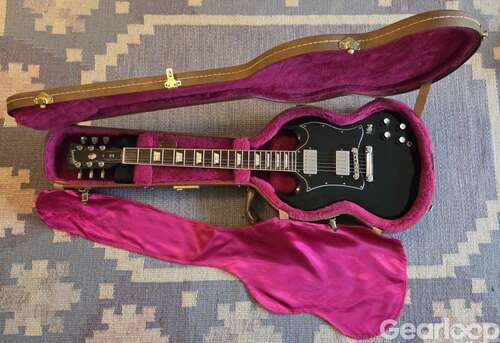 Gibson SG tillverkad år 2000 i Nashville, med originalcase. Serienummer 00400417. En ägare, köptes ny av mig. Normalt slitage, sparsamt använd, mest förvarats i caset senaste 15 åren. Strapsen är utbytta, således ej original. Några små färgfläckar på caset, se bild.