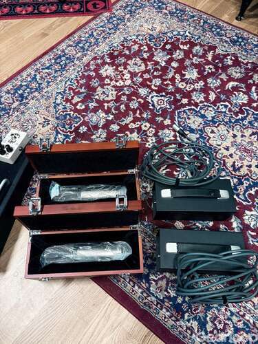 Kommer i kartong med alla tillbehör. Sparsamt använda som rumsmikrofoner till trummor i mina studio.