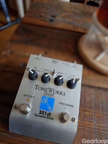 The Korg ToneWorks 301dl Dynamic Echo is a highly versatile delay pedal from the mid-1990s Nazca-line series, housed in the same rugged metal chassis with Nazca geoglyph graphics. It provides programmable delay with advanced features that make it an essential tool for both live and studio use. The 301dl delivers up to 1 second of delay time and includes both Pre-Delay and Feedback controls for shaping the timing and number of echoes. Hi-Fi and Lo-Fi controls allow users to dial in pristine repeats or emulate the character of tape and analog echoes, while High Damp and Low Damp adjust tonal roll-off in both directions for fine-grained control over the repeats. The pedal's signature Ducking function automatically suppresses echoes while playing and restores them when notes decay, ensuring clarity in performance. With two programmable memory slots, input gain and output level switches, and robust build quality, the 301dl is designed for maximum flexibility and reliability.