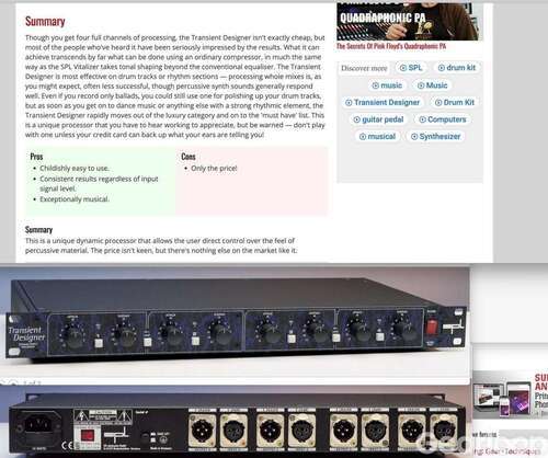 Brutal burk! (Finns på JAM för 7995:-) Beskrivning: SPL Transient Designer 4 är en mångsidig dynamikprocessor med Attack- och Sustain-kontroller på alla fyra kanaler. Transient Designer 4 låter dig styra det övergående svaret och kuvertkurvan för vilken ljudsignal som helst med två enkla kontroller. Även om kontrollerna är begränsade är Attack- och Sustain-kontrollerna allt du behöver för att bli fetare eller mjuka upp ljud du kör igenom det. Transient Designer ger dig optimal kontroll över din dynamik utan komprimering, vilket innebär att du kan hantera din dynamik utan att påverka volymen. Resultatet är naturligt klingande övergående kontroll som kommer att komplettera alla blandningar.