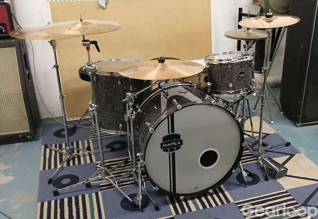 Mapex Meridian, Black Obsidian, limited edition. Ett trevligt, välljudande shellset (alltså bara trummorna som är tre stycken till antalet) i ett behändigt format för att ha en stor bastrumma, med måttet 24"x14". Bastrumman har ett Evans EMAD skinn i gott skick. Hängpuka 12" och golvpuka 16" på fjädrande fötter (!), och de har båda Evans G2 i gott skick som slagskinn. Det finns lite dings här och där på trummorna, men inget som är utmärkande.