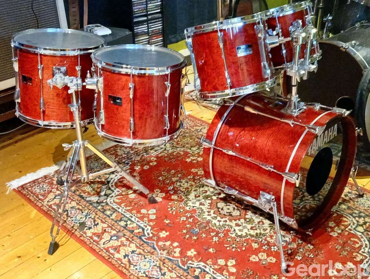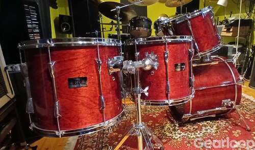 Ursnygga Yamaha Club Custom. Röda trummor i Red Deco kulör med lackade stommar i storlekarna 20", 10", 12", 14", 15". Mycket ovanligt med en 15" golvpuka i denna uppsättning. Stativ för golvpukorna medföljer såklart. Remo Weatherking Ambassador skinn på 15" i använt skick, på övriga pukor Evans G1 i fint skick. På bastrumman sitter det ett Evans EMAD Level 360 i fint skick.