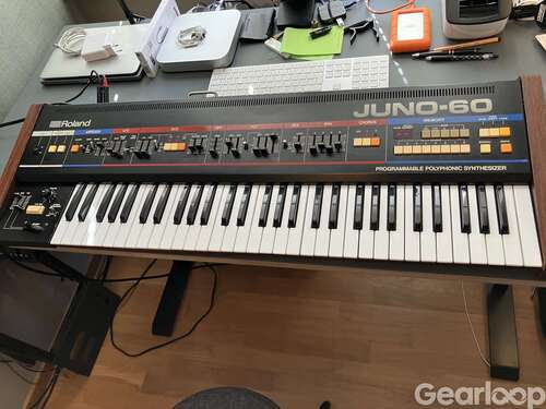 Roland Juno-60 med Kenton Pro midi. Nyservad, kalibrerad och rengjord ordentligt med ett gäng kondensatorer utbytta. Allt fungerar precis som det ska. Träsidornas plastfilm utbytt. Två tangenter har lite kosmetiskt skav. En orange knapp ej original. Softcase till. Kan provspelas i Malmö. Skickas ej.