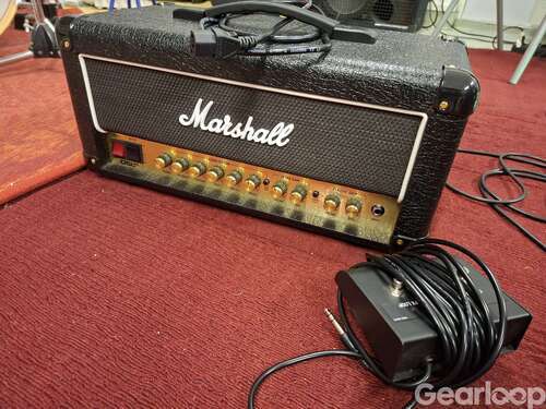 Helrörsförstärkare från Marshall, 20W i mycket fint skick. Har enbart använts i replokalen. Fotomkopplaren är kardborrad för pedalbordsbruk, men originalplattan (gummimtrl) finns att tillgå. Se Tyskenlänken för spec: