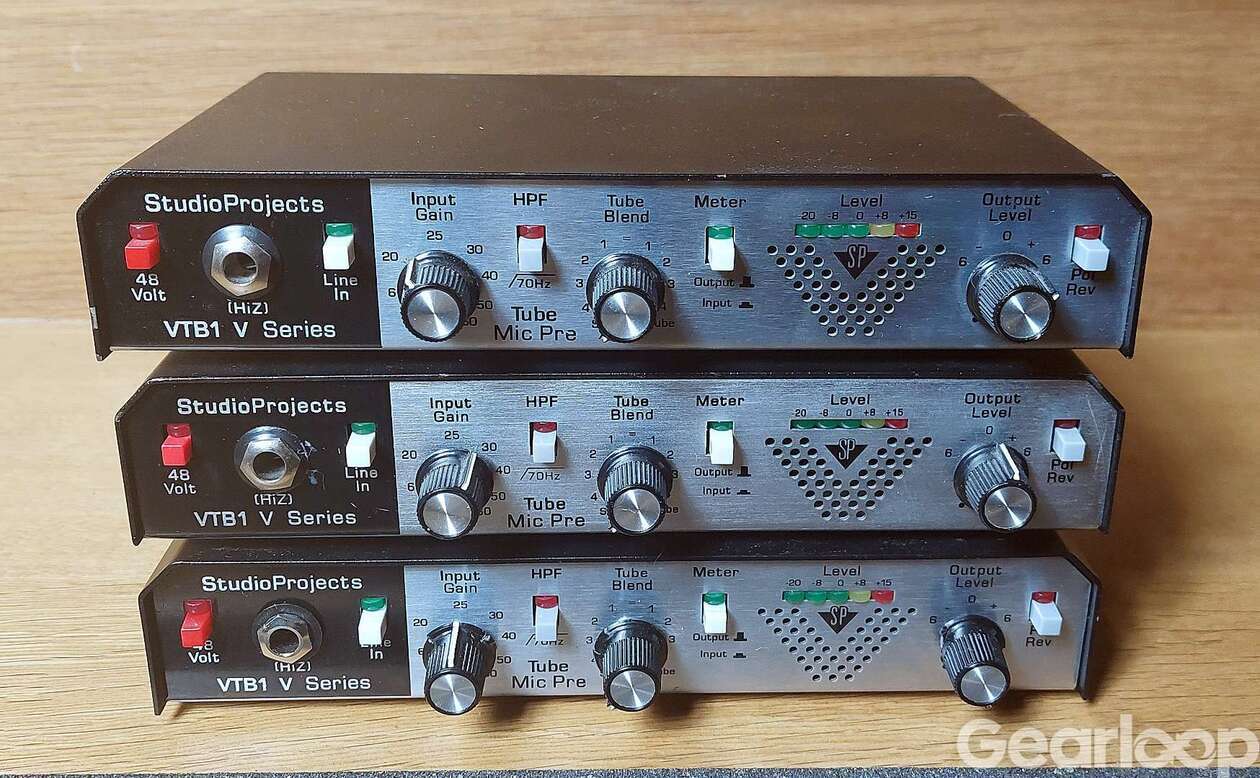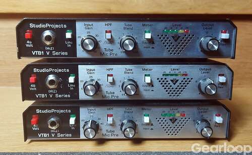 Studio Projects VTB1 mikrofonförstärkare som har allt man kan begära: 48V fantommatning, instrumentingång med HiZ-impedans, lineingång, högpassfilter, fasvändning, volym in och ut, insert, XLR in, XLR och tele ut, valbar mikimpedans mellan 50 och 200 Ohm, samt möjlighet att steglöst koppla in ett 12AX7-rör som ger extra värme och kan få t ex sång att lägga sig perfekt i mixen med en gång.
