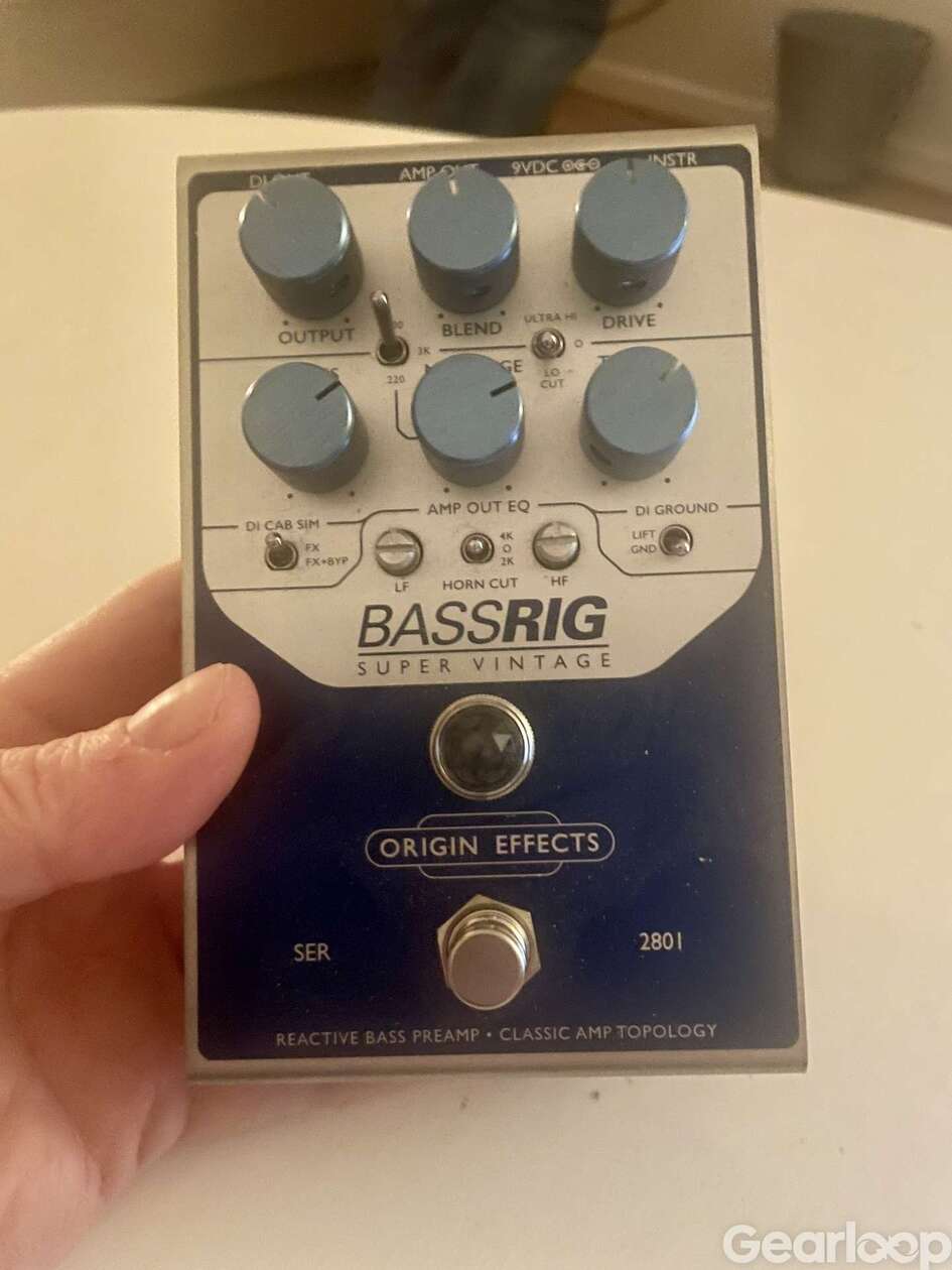 Origin Effects Bassrig Super Vintage baspedal med kontroller för Drive, Treble, Middle, Bass, Level och Blend. Utrustad med switchar för att välja mellan Master BBD Flanger och Classic Amp Speeddelay. Designad för att användas med basgitarr.