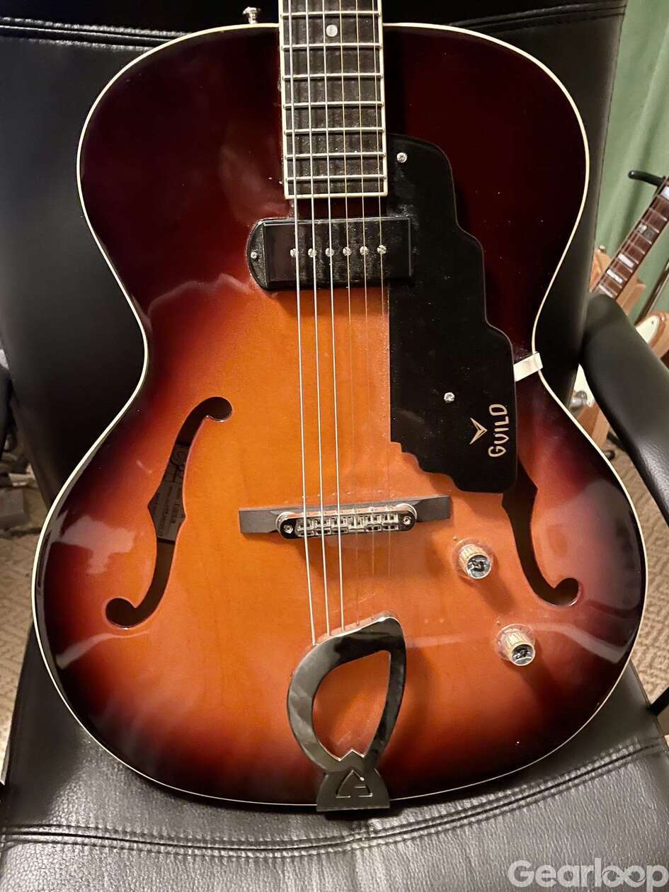Guild Elgitarr med sunburst-finish. Halvakustisk design med två ljudhål. Svart pickguard med Guild-logotyp. Fyra reglage och en justerbar bro. Passar för olika musikstilar och speltekniker.
