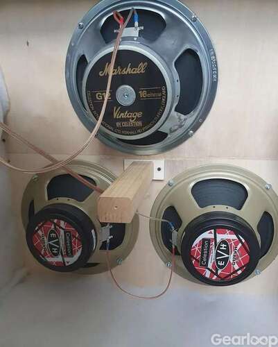 Säljer denna handgjorda Laboga 3x12 högtalarkabinett, ja, du läste rätt 3x12. En ovanlig högtalarkabinett som låter fantastiskt med sina två EVH-greenbacks i botten och en Marshall V30 (original V30). Alla tre högtalarna är naturligtvis tillverkade i England. Bättre byggkvalitet än både Marshall och Mesa enligt min mening. Den är i absolut nyskick. Anslut stereo till din förstärkare på 8 ohm, eller kör två förstärkare i den på 16 ohm vardera. Om du endast är intresserad av högtalarkabinetten kan den köpas separat för 1990kr. Högtalarelement separat 1200kr, mängdrabatt vid köp av flera högtalarelement kan diskuteras vid intresse.