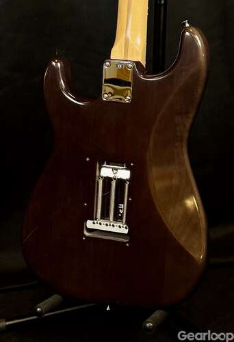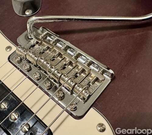 Mycket fint skick. Kroppen har några få mindre lackskador. Samtliga delar är original till instrumentet. Stallklackarna intrimmade för att matcha greppbrädans 9.5” radie. Stallet är justerat helt liggande mot kroppen, men fortfarande fullt svajbart framåt/nedåt.