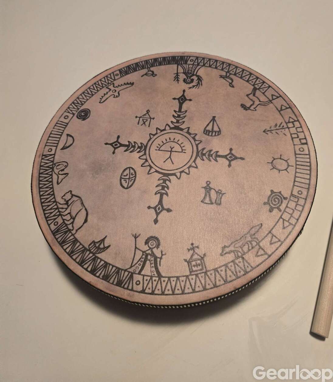Motiven ger ett kraftfullt, naturinspirerat uttryck och gör att trumman passar både för ceremonier, meditation och som unik väggdekoration.