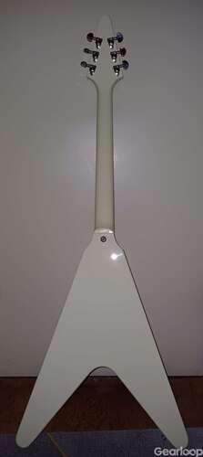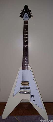 Denna var från början i aged cherry, men har lackats om professionellt i nitrocellulosa classic white. Slim-taper hals, banden är som nya och förutom en mindre ding och en aning nött lack under vingarna (se bilder) så är den i toppskick. Original hard-case medföljer. Utrustad med en Dimarzio X2N i stallet. OBS! Förra ägaren hade förstört halsmickens utrymme i träet så vid omlackering pluggades det utrymmet igen. Så det är helt slätt under plektrumskyddet och det går inte att installera en halsmick där. Original-mickar följer ej med, men original plektrumskydd följer med.. I övrigt är allt original. :)