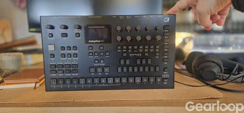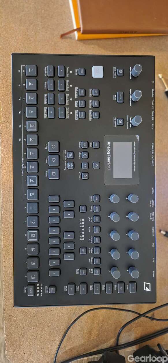 En fin Analog 4 i den föredragna svarta färgen. likt Analog Rytm så är filtrena och effekterna lite vassare i framtoningen jämfört med alla mindre lådor. Det händer mer när man rattar dem. Föregående ägare har orsakat en liten ding mellan knapp 7 och 8. Inget övrigt finns kosmetiskt att anmärka på. Skärmplasten är fortfarande kvar. Jag ska ha köpt soundpacks från användare på Gumroad, de ska ligga i men vi kan ju kika på det vid eventuellt köp. Orginalkartong finns men i dåligt skick då förra ägaren sände kartongen som det yttre lagret när han sålde den till mig. PSU ingår såklart!