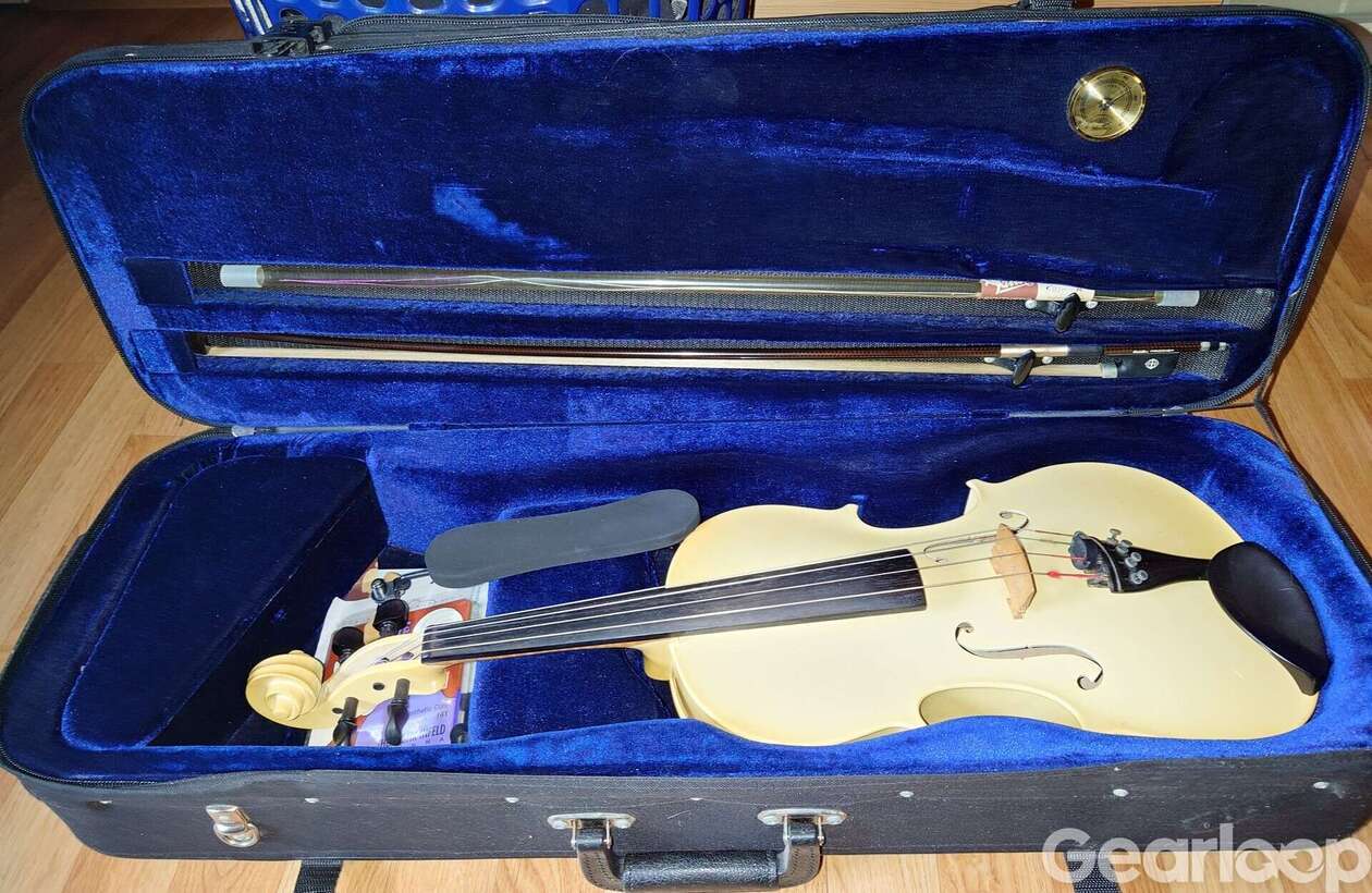 Föredetta vit (tyvärr numera nikotingul med åldern) altviolin i annars gott skick. Strängar kan eventuellt behöva bytas då de är färskvara. Stråke i kolfiber, harts (kanske lite gammalt), axelstöd, sordin och väska ingår.