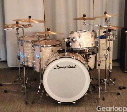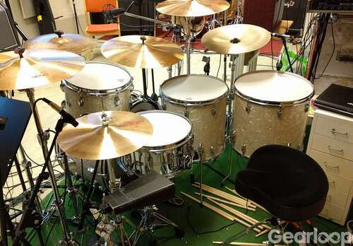 Slingerland från tidigt 70-tal. Trelagers-stommar med massiva stödsargar. Omklädda med Delmar White Marine Pearl Antik. Virveln är chrome over brass. Det är enbart trummorna med enkla trumväskor som är till salu, inga ställ eller cymbaler. Säljes till någon som tycker dom är värda 20-tusen eller till någon annan som tycker dom är värda mer eller mindre:)