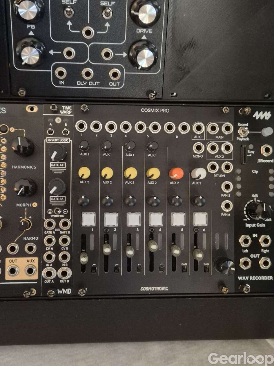 Cosmotronic Cosmix pro. Ett stycke mixer med två stereo och fyra mono kanaler samt två send. Jag har monterat längre rattar på stereo-send-rattarna. Skickar även med gummihöljen som sitter på sliders. 3200 spänn.