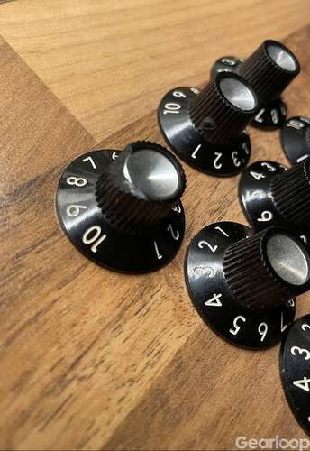 För över två år sedan fick jag då min Silverface Dual Showman Reverb topp ombyggd till 1960-63 års 6G14-A Brownface-specifikationer. Nu håller jag på att ändra utseendet på kabinettet och sånt. Den här kompletta uppsättningen med originalrattar och spill på tygkablar, RCA-uttag för reverbet, kolmotstånd osv kan kanske tilltala någon som håller på att restaurera/bygga om sin förstärkare? En av rattarna är något skadad, se bild, annars är de alla i utmärkt skick.