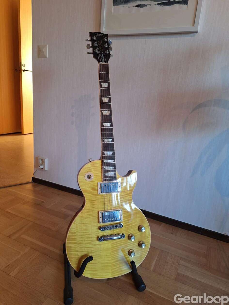 Gibson Les Paul Standard från 2015, Asymmetrical SlimTaper hals, Låsningsbara stämmisar, fin flametop, 2015 hade gibson push/pull rattar och weight releived, nu sitter det gibson 57 classic humbucker i den och elekroniken är bytt, ( push/pull är borttaget) skickas med vid ev köp.