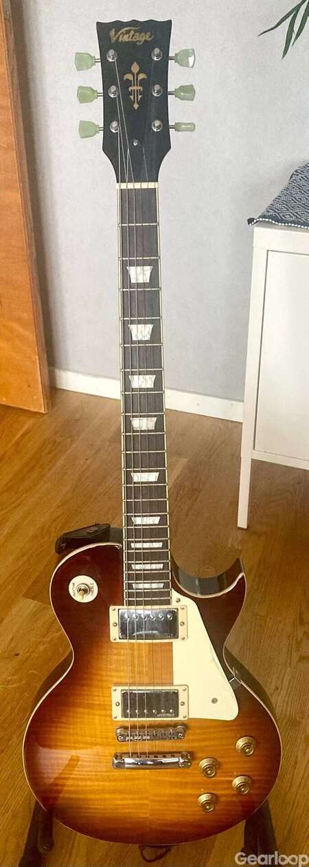 Säljer min sons gitarr som jag efter sökande på nätet tror bör vara en V100 Reissued i en mörk Sunburst-finish (ev Tobacco Sunburst eller Flamed Iced Tea). Den är i bra skick och inte mycket använd, endast små märken som inte är iögonfallande. Min bror som är erfaren gitarrist har provspelat och bekräftar att den är lättspelad och känns gedigen. Men man behöver testa den före köp, och jag har inget case, så därför skickas den ej. Om man går in på hemsidan (vintageguitarsus) så kan man läsa alla detaljer. Det enda jag har märkt är lite brum/störningar när man kopplar in den till tex ett ljudkort eller förstärkningar, mer som är vanligt vid single coil-pickups. Detta kan ev tyda på att elektroniken, jordning osv bör ses över inuti gitarren eftersom dessa double-coils bör vara tysta och inte lika mottagliga för störningar. Jag har satt ett utgångspris men är öppen för vidare diskution då de inte verkar säljas i Sverige för närvarande med ett angivet listpris att förhålla sig till. Fler bilder kan ordnas.