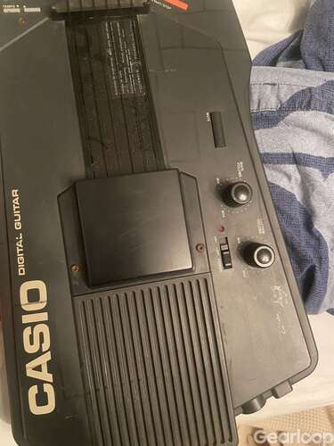 klassisk digital ”synth”-gitarr som även har lite fräcka trumloopar. Den fungerar men är i vissa strängar/band lite trög/glappar. Något snille kan säkert få den som ny igen.