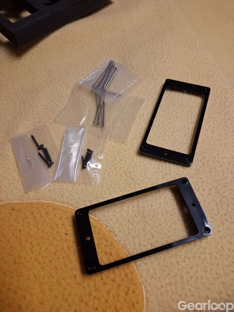 Black, unused mounting rings for humbuckers. The bottoms are bowed so I would assume this would be for an archtop or carved top type guitar like a Les Paul. They came with a set of brand new Seymour Duncan Seth Lover humbuckers.