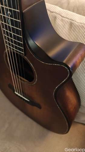 Gitarren är av Grand Auditorium modell byggd helt i solid hawaiisk koa ksidan och genererar ett djärvt, artikulerat mellanregister med distinkta raffinerade diskanter och värme i basen. Koa är också känt för att bli bättre med tiden och kommer att öppna sig ljudmässigt och spela med mer djup ju äldre gitarren blir. V-klass bracing förbättrar responsen med större volym och längre sustain. En uppsjö av komfortfunktioner inkluderar ett armstöd, avfasad utskärning och avfasade kropps- och greppbrädekanter. Gitarren har Taylors Expression System 2 inbyggt och kommer i ett premium hardcase.