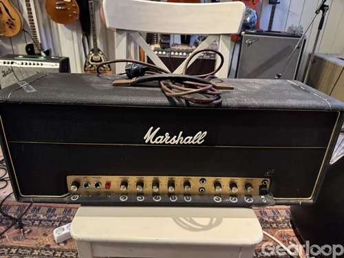 Marshall Artistée. Om jag förstår internet rätt så från 1974. Förstärkaren är modifierad så att ena kanalen är kopplad med den andra i serie, två förförstärkare i rad = bra dist. Kopplar man in i andra kanalen så är det "original"- bara en förförstärkare. Ordentligt sliten men funkar bra och låter toppen! Jag har en flighcase som kan följa med till rimligt pris.