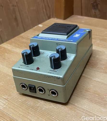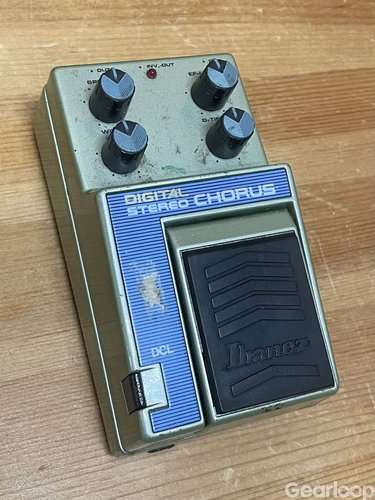 Vintage Ibanez Digital Stereo Chorus gitarrpedal med digital stereo chorus-effekt. Pedalen har flera rattar för justering av ljudparametrar och anslutningar för in- och utgångar. Tillverkad 1985 till 1986 i Japan. Påklistrat kardborreband på undersidan för att den suttit på pedalbord.
