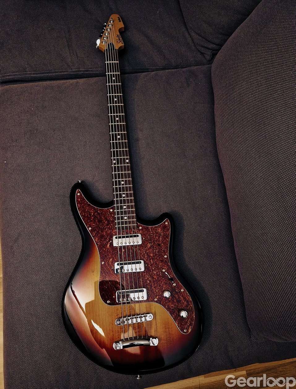 Schecter Hellcat VI (sex strängad) Diamond Series elgitarr/bas med sunburst-finish. Gitarren har tre mini humbuckers med fem pickup-konfigurationer.