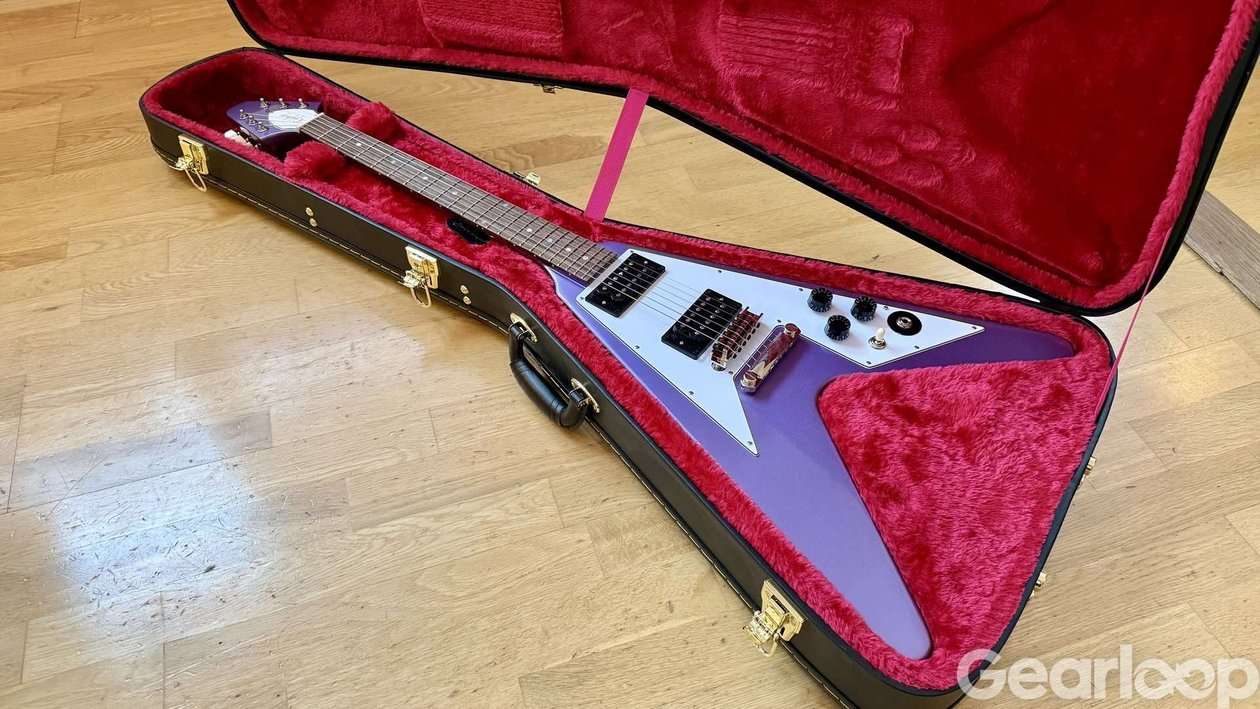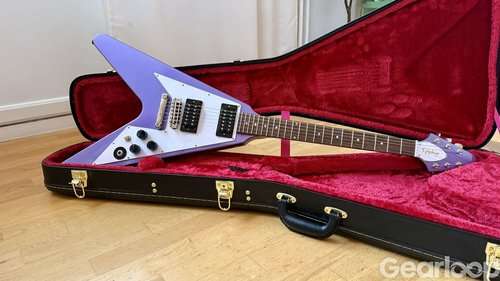 En knappt rörd Flying V Kirk Hammett signaturmodell i lila metallic. Tyvärr mest legat i sitt case.