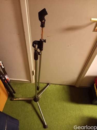 Mikrofonstativ två stycken i bra men använt skick med bom och ett rakt som fungerar som det ska men är slitet och har en sned skruv till foten. Alla är i stål och stabila.