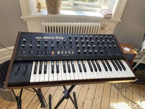 Korg Mono/poly i bra skick. Liten kosmetisk skada på baksidan av ena träsargen.