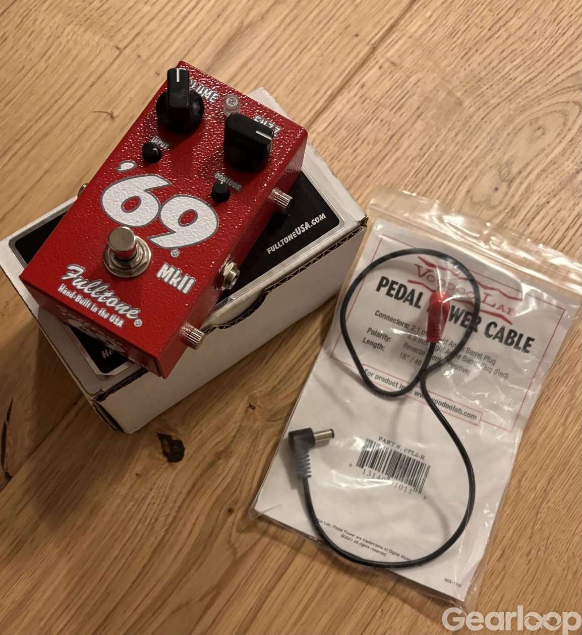 Fulltone '69 Fuzz MkII - modern klassiker. Mike Fullers underbara take på en Fuzz Face, men med möjlighet att tweaka till perfektion. Låter fantastiskt. Saknar en av skruvarna till bottenplattan men inget som påverkar funktion. kommer med kartong. Skickar med adapterkabel från Voodoo Lab för att få center positiv, så att man inte bränner pedalen om man tröttnar på att köra bara på batteri. Om man är snäll. Passar fint i vanlig strömförsörjning.