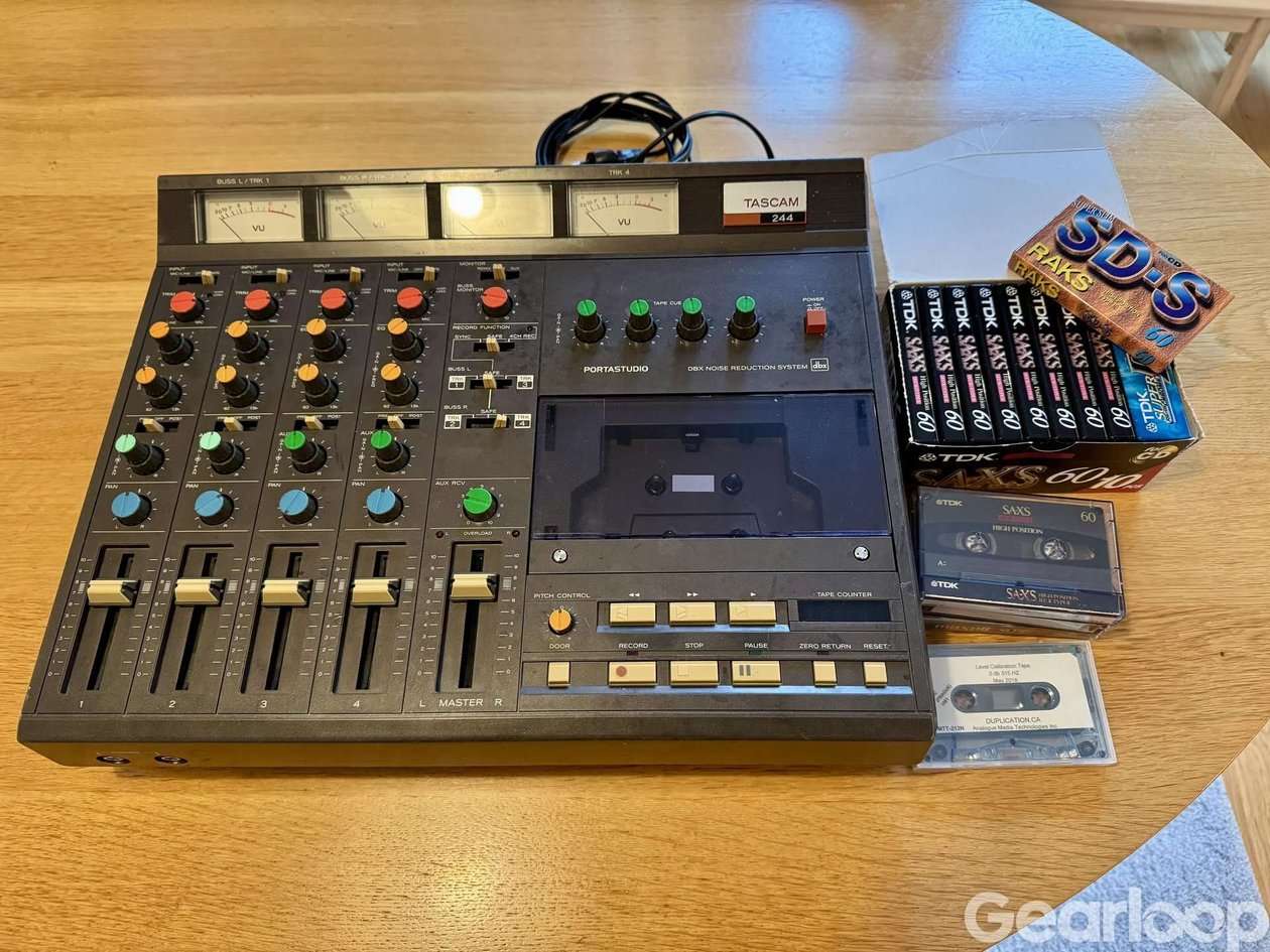 Jag säljer en Tascam 244 i nyservat skick! Nya drivremmar, nya lampor till VU-mätare, nya säkringar till alla kretskort, nya kondensatorer till hörlursförstärkaren, rengjorda och smörjda channelstrips 1-4 samt två lagade inputs. Allt funkar och låter jättebra!