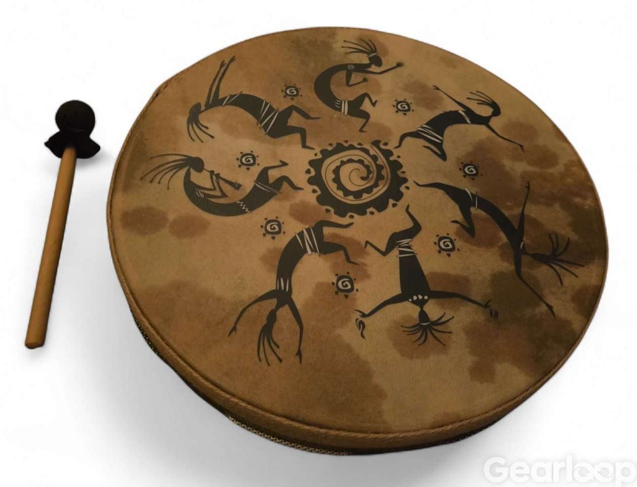 Vacker handhållen shamantrumma gjord utav koskinn och svart handmålat motiv i stil med dansande figurer runt en spiral.