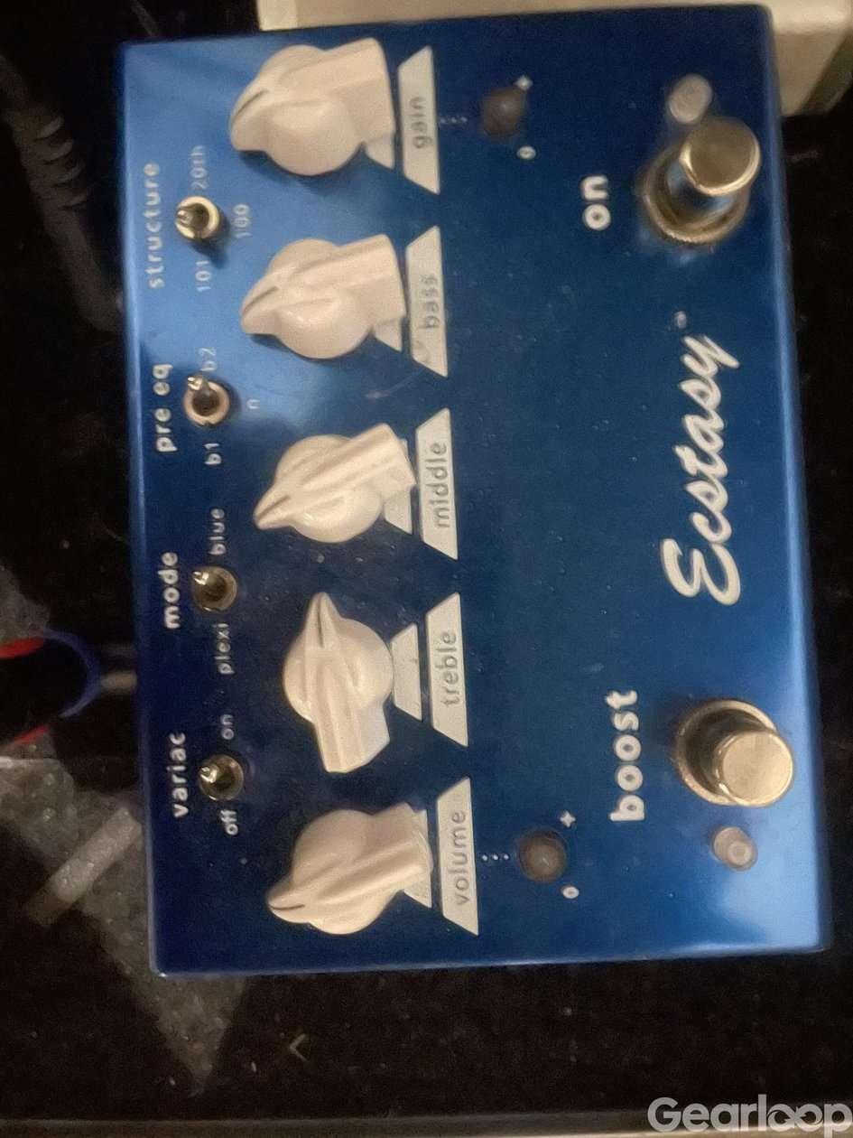 Bogner Ecstasy gitarrpedal blue. Pedalen har flera reglage för bland annat struktur, pre EQ, mode, variac, gain, treble, middle, bass och volume samt fotomkopplare för on och boost. Avsedd att forma ljud och förstärka signal från elgitarr i olika spelsituationer,