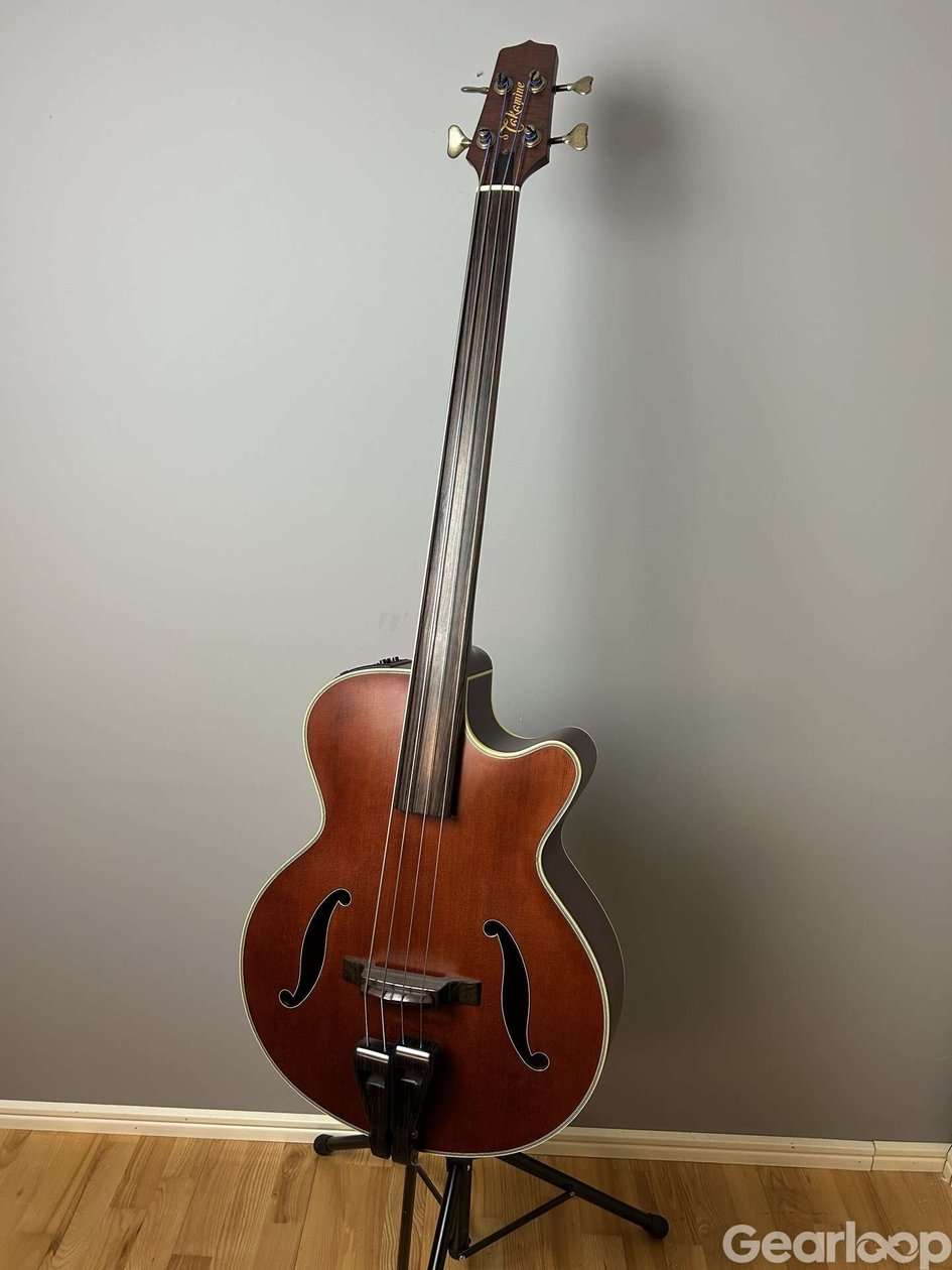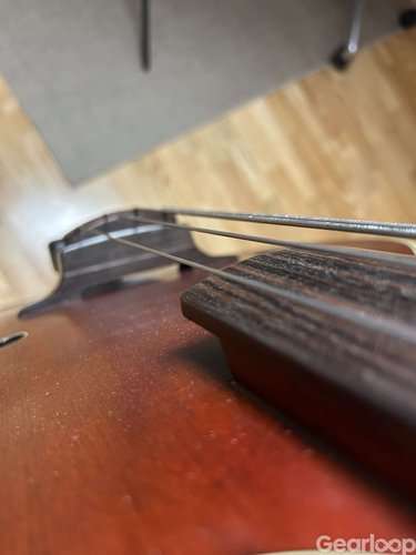 A unique hybrid crossover bass guitar, it retains the 34” scale but the fretboard has the radius of an upright bass, which allows for bowing. It can be played as a regular bass guitar or as an upright with the tail pin extension peg. This fretless instrument produces a tone heavy and fundamental with the rich harmonics you would expect from an upright bass.
