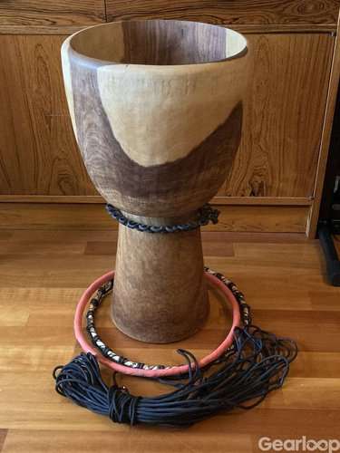 Säljer en välgjord och fin djembe utan skinn, med ringar och rep. Den hade en bra och välbalanserad klang med skinn på. Har en liten spricka i kanten, men inget som har påverkat klangen och kanten är ändå jämn. Den är 31 cm i diameter upptill och 56 cm hög.