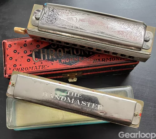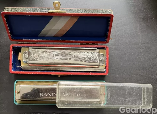 Munspel 2st. Hohner chromatic är en gammal goding, ursprungligen från tidigt -30 tal. Fungerar hjälpligt med trasig knapp. Bandmaster funkar hjälpligt.