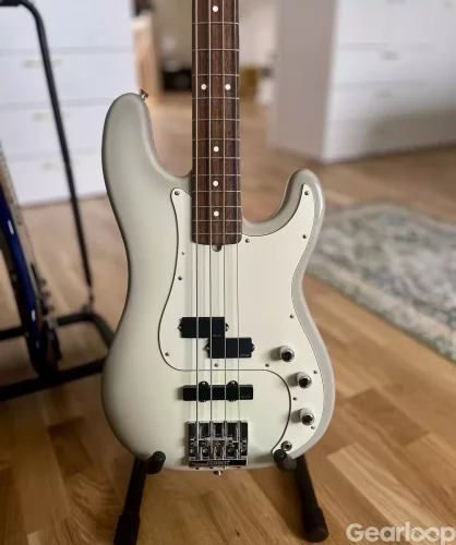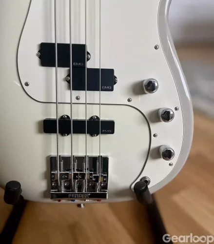 Underbart snygg och mäktig Fender Precision Bass PJ elbas i vit (antigua?). Instrumentet har en kropp i alder och hals med greppbräda i rosewood. Den är ett hopplock av olika högkvalitativa delar: